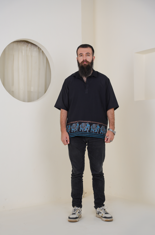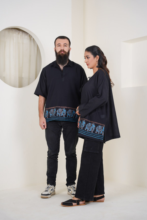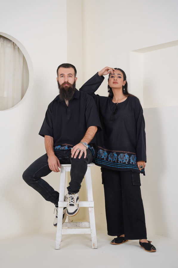 A tribute to memory, strength, and movement, this black and blue kurta carries the spirit of the elephant in every detail. Hand block-printed with