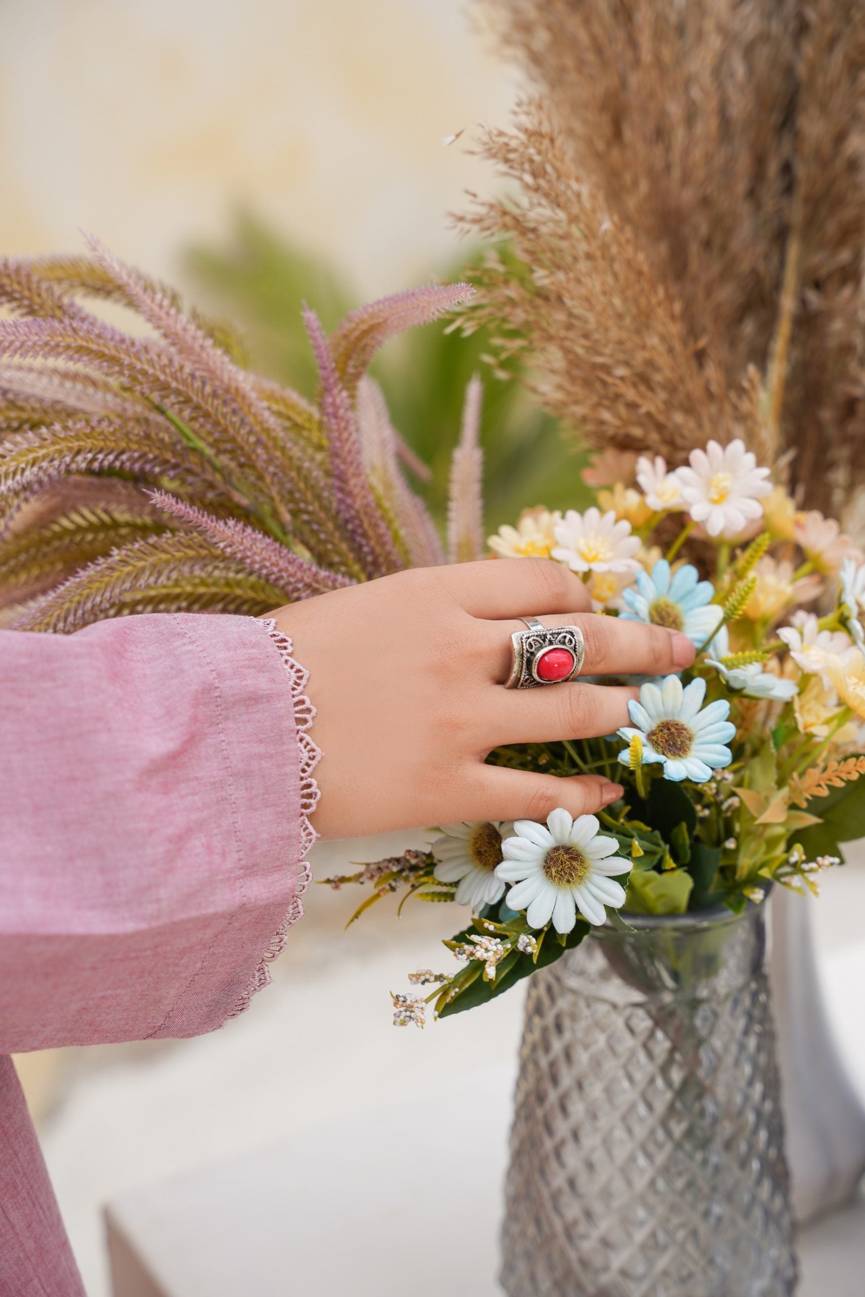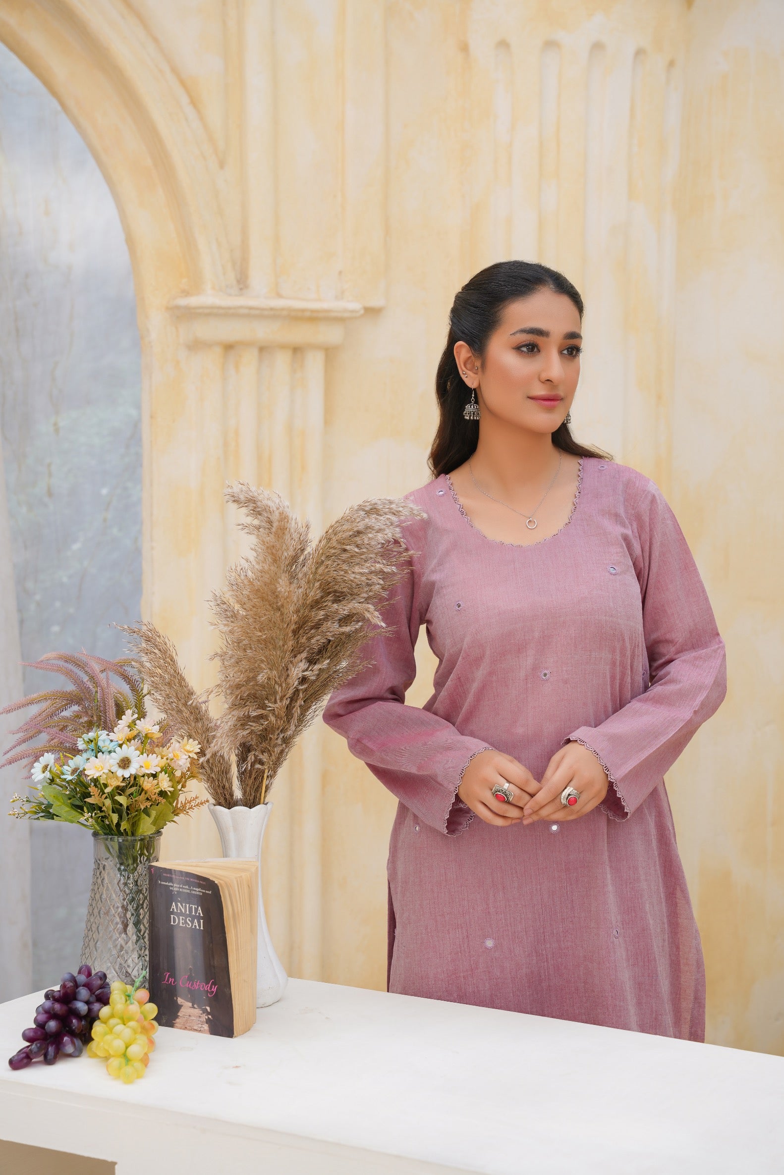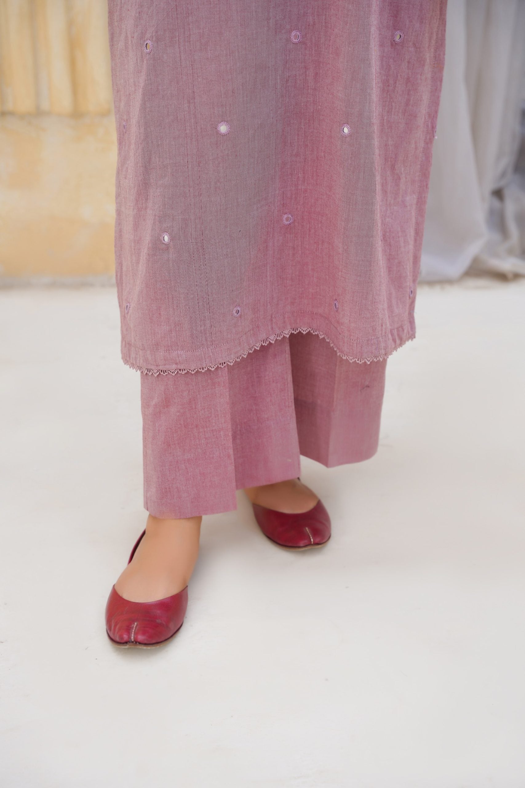 Heer, Soft and sophisticated, this tea pink shirt and trouser ensemble blends traditional charm with feminine grace. The mirror work adds a subtle sparkle, beautifully