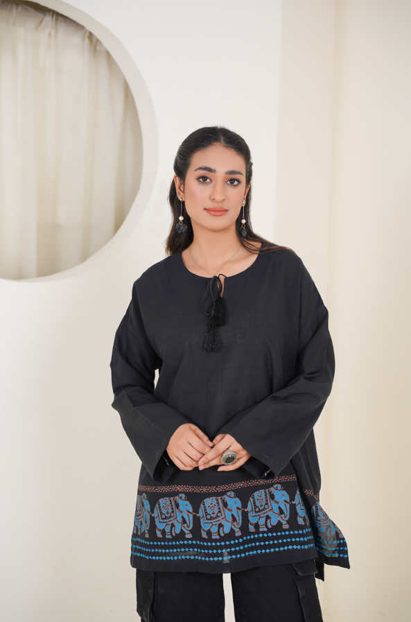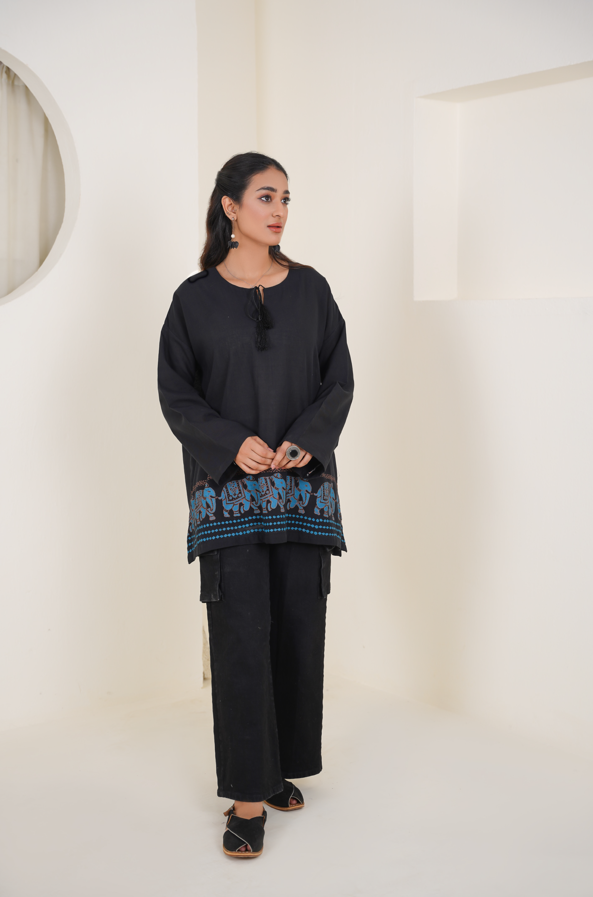 Rooted in grace, adorned in legacy — Iraaya is an ode to strength wrapped in softness. This black kurta, tailored from fine, breathable fabric, carries bold yet
