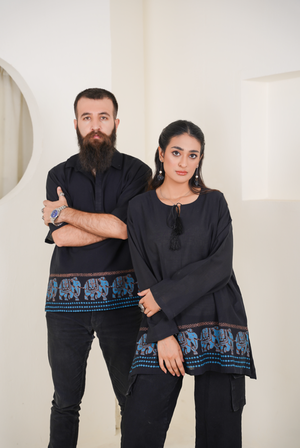 contrast of black and blue lends a quiet depth, making this kurta an effortless statement of heritage and individuality.