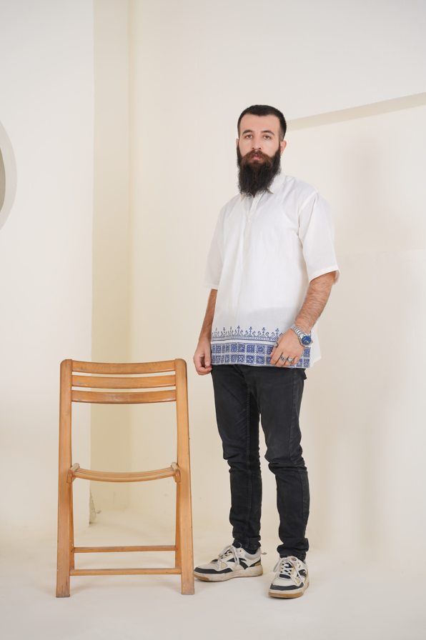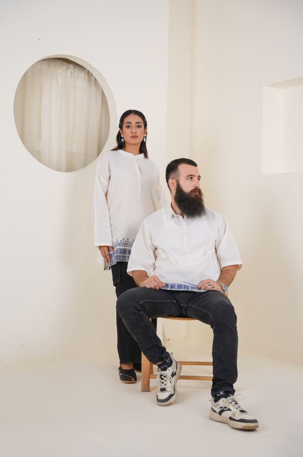 Clean and captivating, this white kurta is elevated by sharp blue geometric block prints that bring structure and rhythm to the fabric.