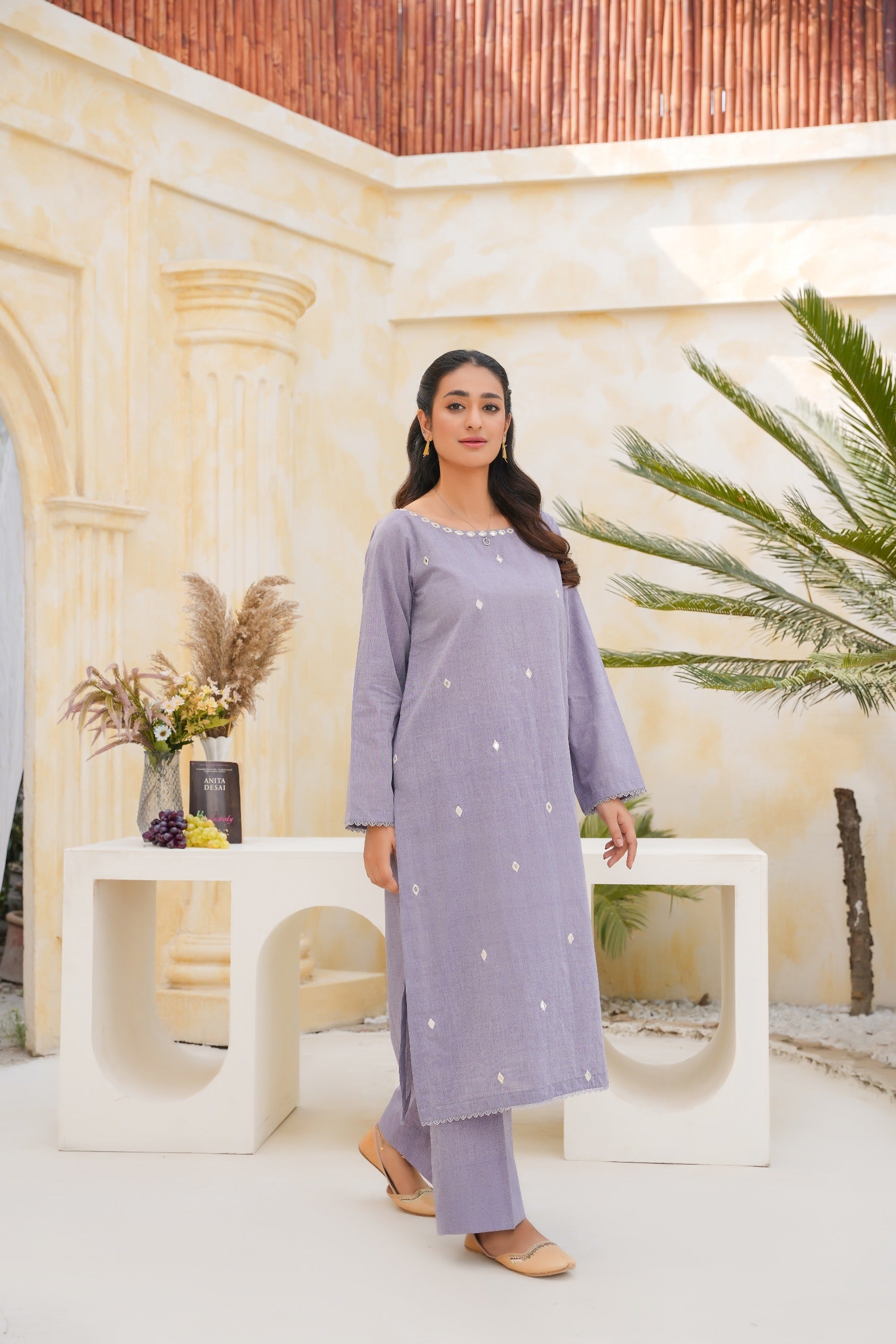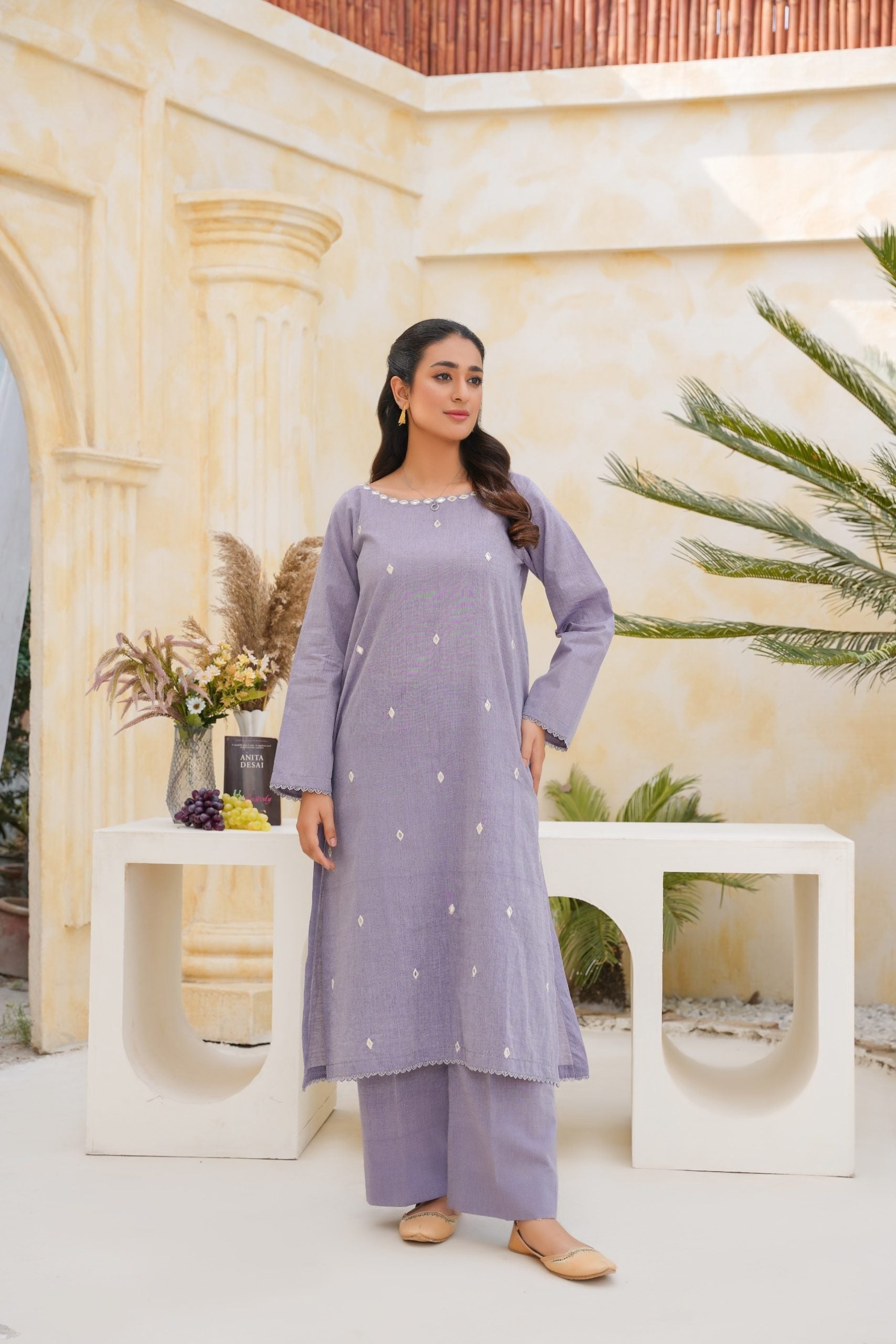 “Mehraab” is a graceful tribute to timeless craftsmanship. Set in a rich purple hue, the shirt and trouser ensemble features handcrafted diamond-shaped mirror work