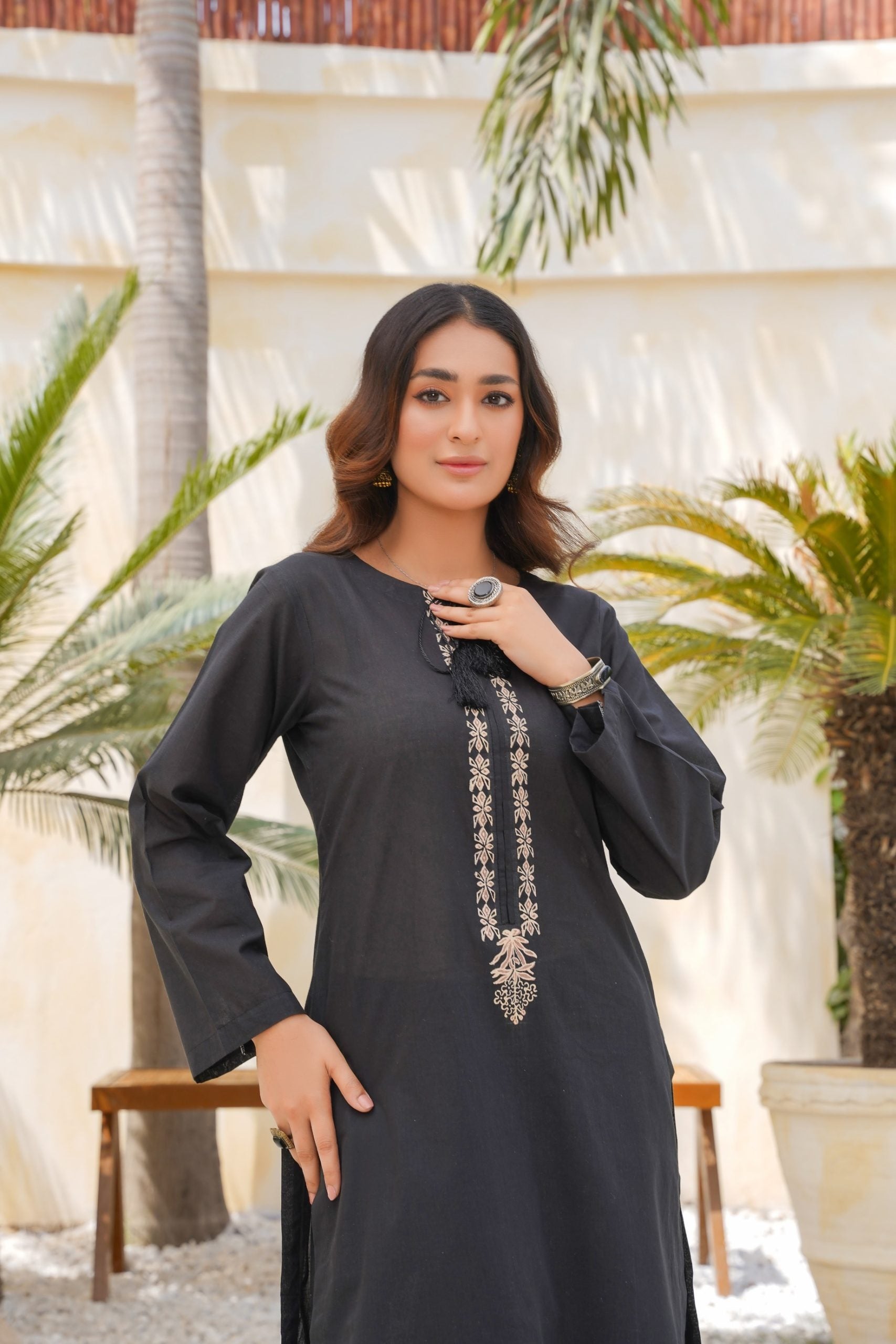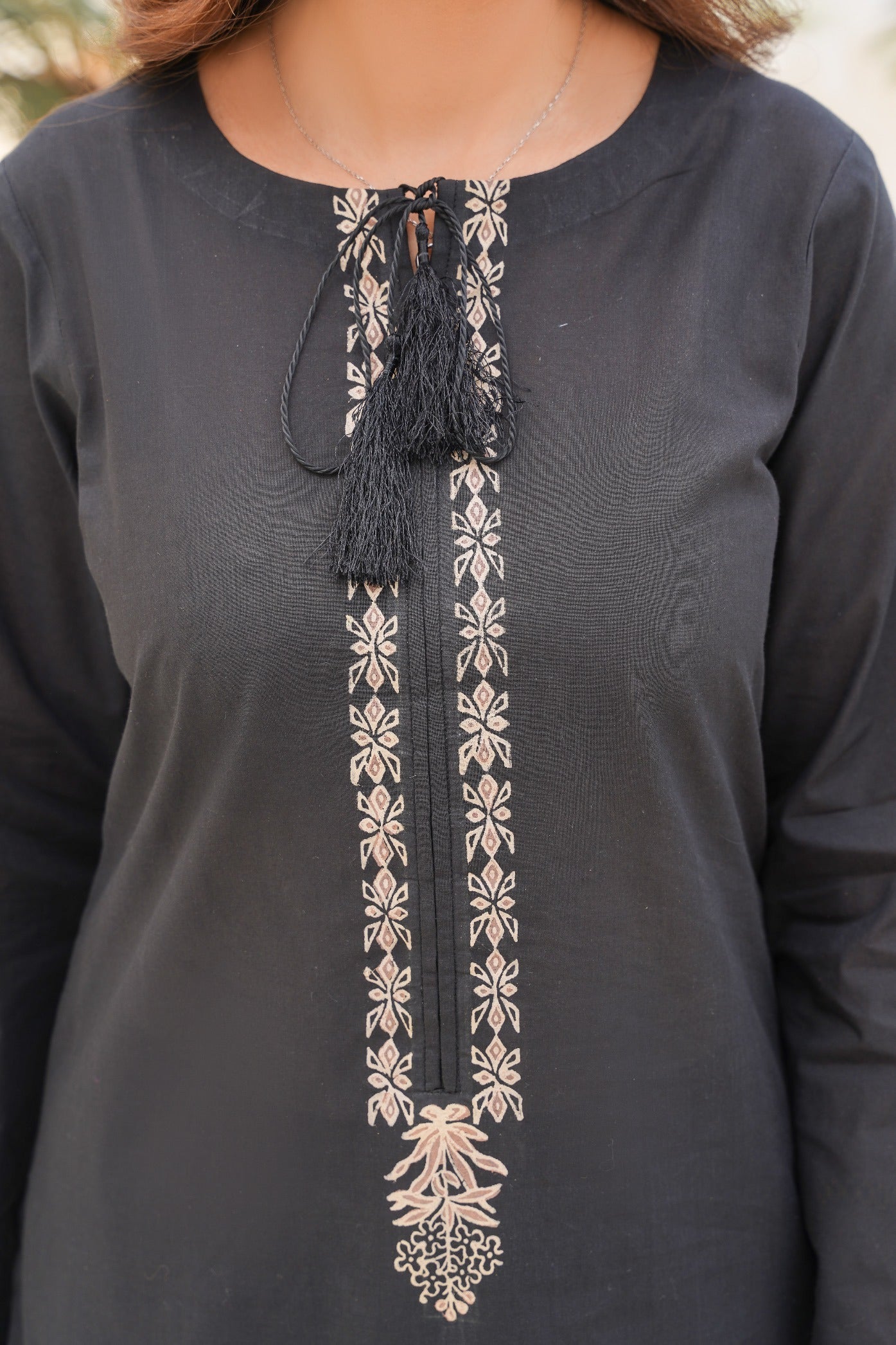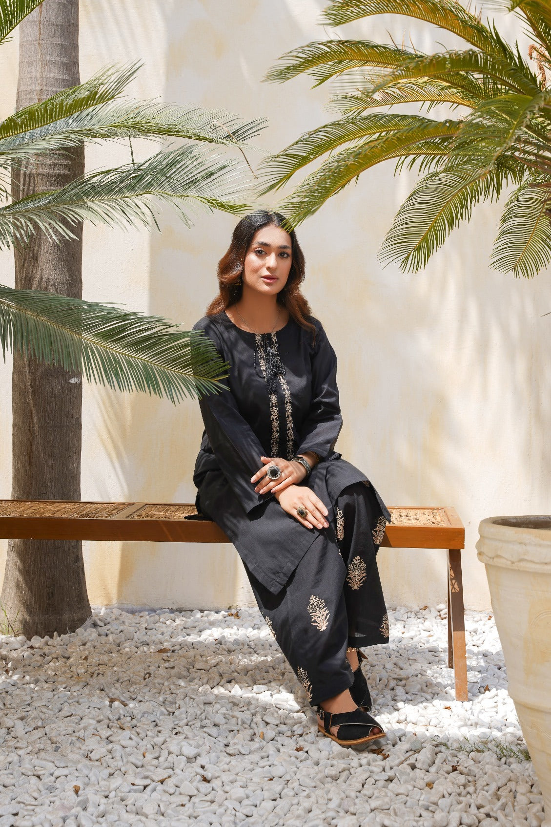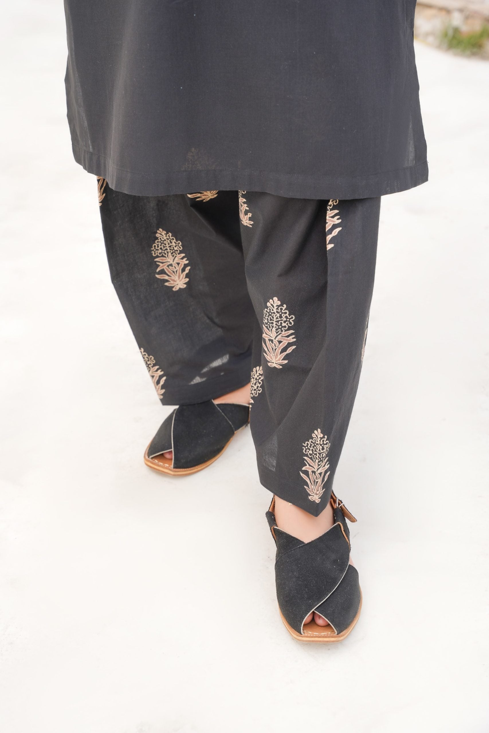 In the depth of black lies a quiet strength, a canvas for stories steeped in tradition. This shalwar kameez carries the warmth of coffee and the richness of brown in antique block prints—each motif a nod to heritage, each detail whispering history.
